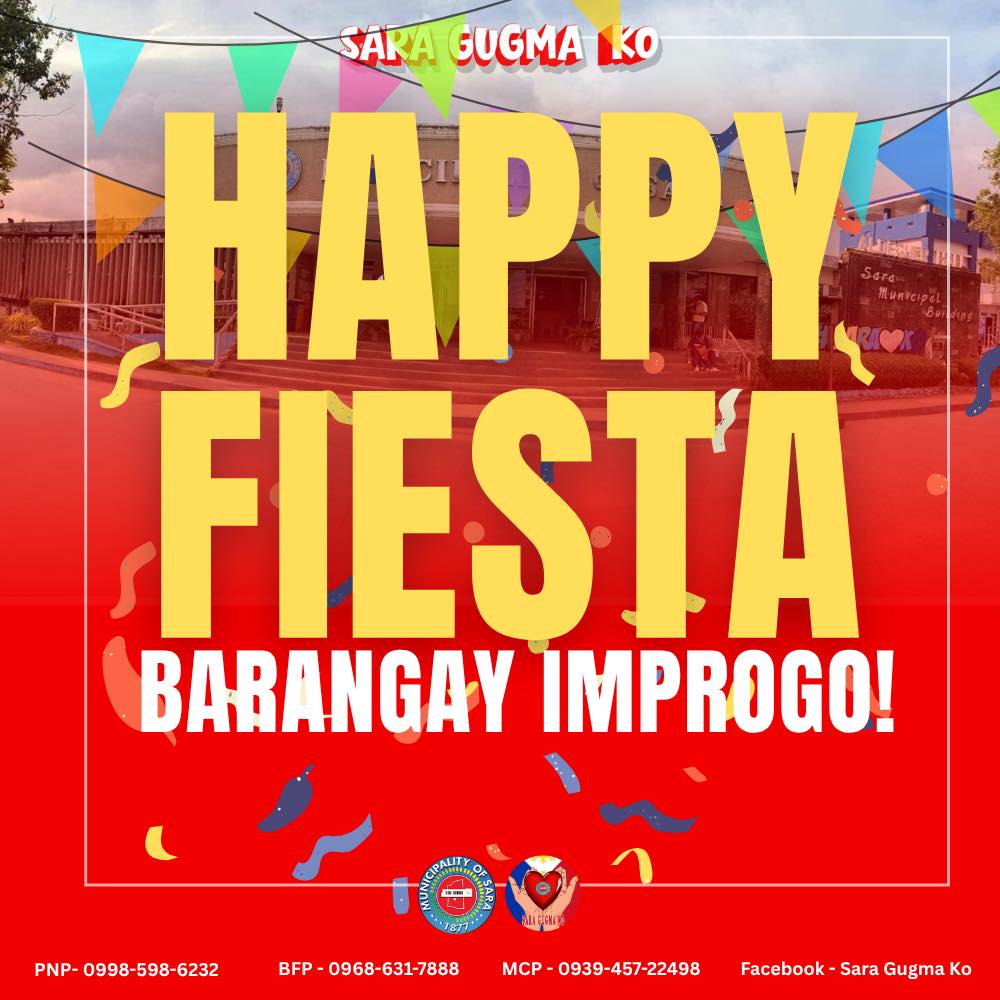 Malipayon nga Pista, Barangay Improgo. Sa sini nga balaan kag masinadyaon nga okasyon, ginadumdum ta ang matahum nga kasaysayan, marig-on nga paghiusa, kag matahum nga kultura sang aton barangay. Kabay pa mangin padayon ang grasya sa tagsa ka panimalay, magpuno sang kalinong kag kauswagan sa tagsa ka tagipusuon, kag magapadayon ang pag-uswag sang Barangay Improgo bilang isa ka komunidad nga ginabugkos sang paghigugma kag pag-alagad.