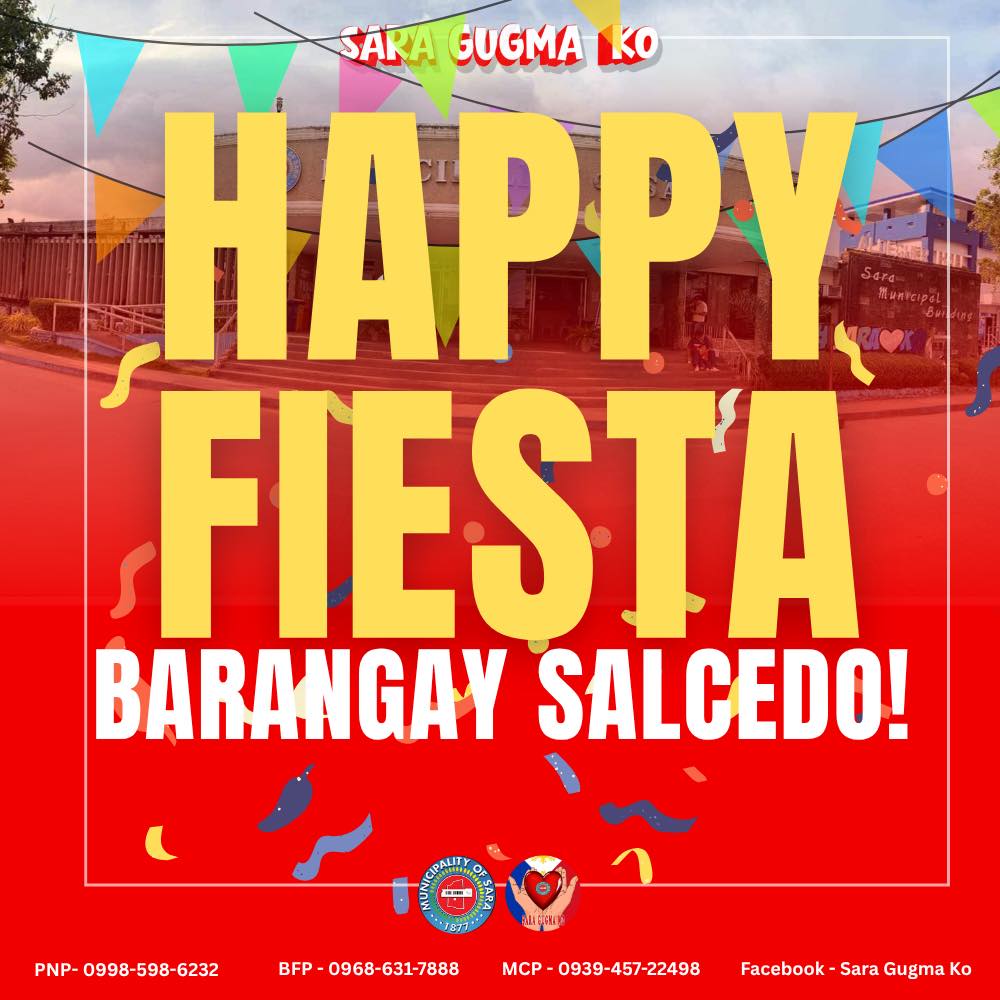 Malipayon nga Pista, Barangay Salcedo. Sa sini nga balaan kag masinadyaon nga okasyon, ginadumdum ta ang matahum nga kasaysayan, marig-on nga paghiusa, kag matahum nga kultura sang aton barangay. Kabay pa mangin padayon ang grasya sa tagsa ka panimalay, magpuno sang kalinong kag kauswagan sa tagsa ka tagipusuon, kag magapadayon ang pag-uswag sang Barangay Salcedo bilang isa ka komunidad nga ginabugkos sang paghigugma kag pag-alagad.